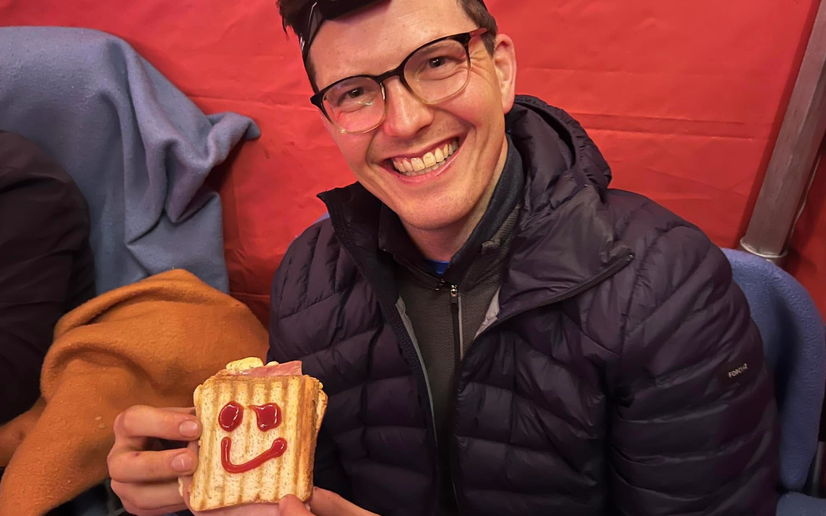 Als houvast kijk ik uit naar Chez Ingo. Dit is het laatste tussentijdse checkpoint voor de finish en kan het best omschreven worden met het woord ‘oase’. Het is een partytent met kachel, discolampen en oneindige aanvoer van tosti’s. Eenmaal aangekomen bij de plek van tussentijds checkpoint 4.1 word ik opgewacht door twee vrijwilligers. Het is pikkedonker en ik zie nog geen discoverlichting. Vanachter hun hoofdlampjes klinkt een warme stem die zegt: “Hey Tom, hoe gaat het? Je moet hier oversteken en dan daar het bos in.”